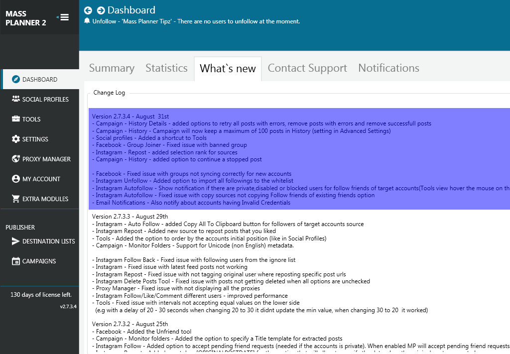 • Campaign – History – Campaign will now keep a maximum of 100 posts in History (setting in Advanced Settings)