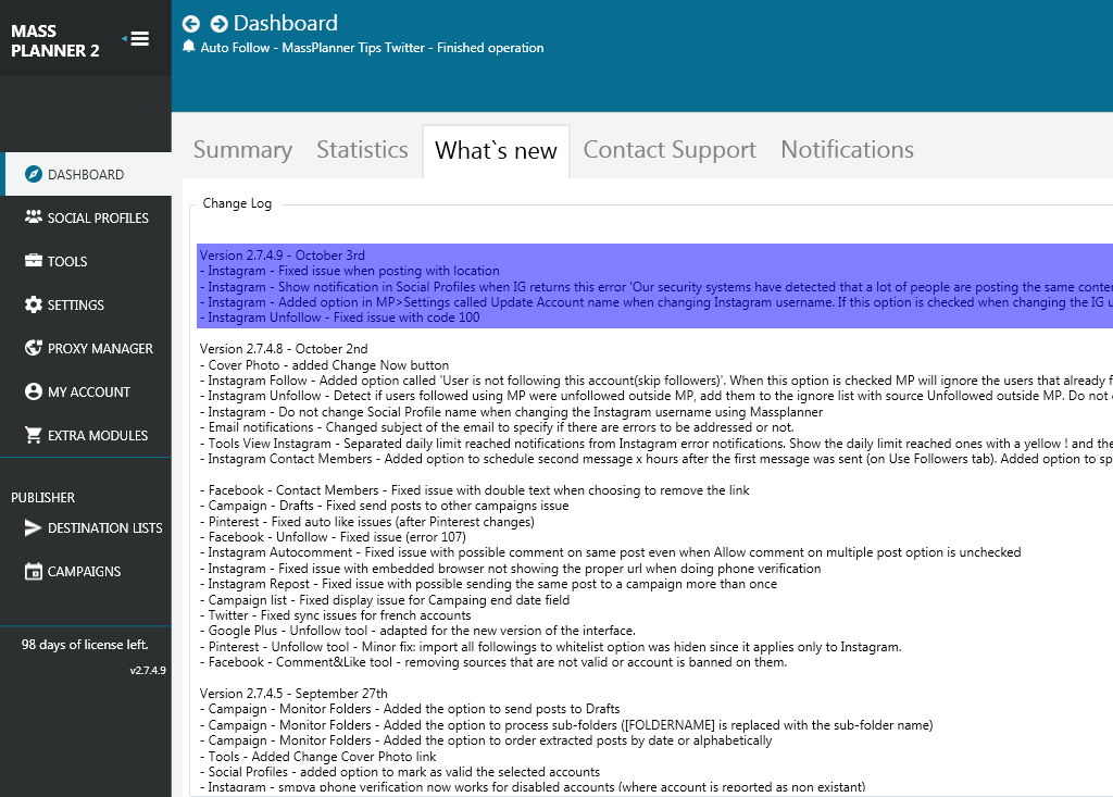 Mass Planner was updated to version 2.7.4.9 on October 3, 2016. This update includes;